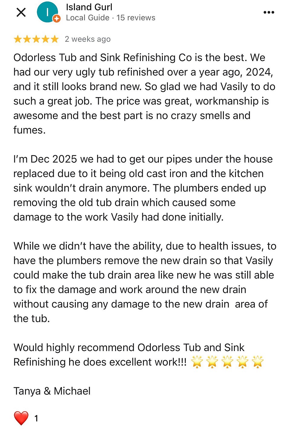 Odorless Tub & Sink Refinishing Company We are ready to restore your Tub, Sink, Shower Bases, and Walls. 🛀 We use Safe, Eco-Friendly, and Highly Durable Materials and Techniques – Perfect for Homes, Apartments, Hotels, Senior Living, and Beyond.