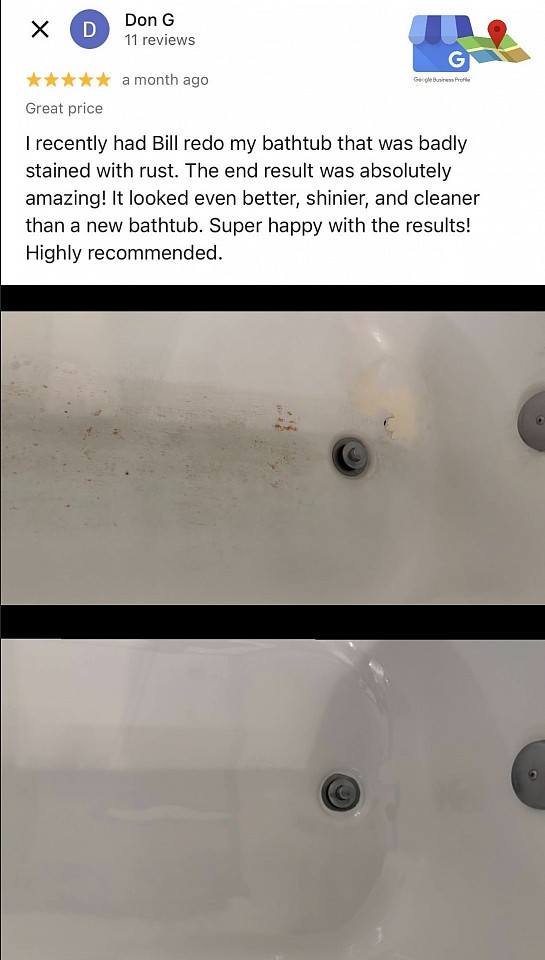“ Bill did an incredible job of refinishing my 1950's bathtub and sink! I'm not exaggerating when I say they look like new…The cost was reasonable. I highly recommend…”- Ja, San Antonio ⭐️⭐️⭐️⭐️⭐️ 🌍 View this review on Google